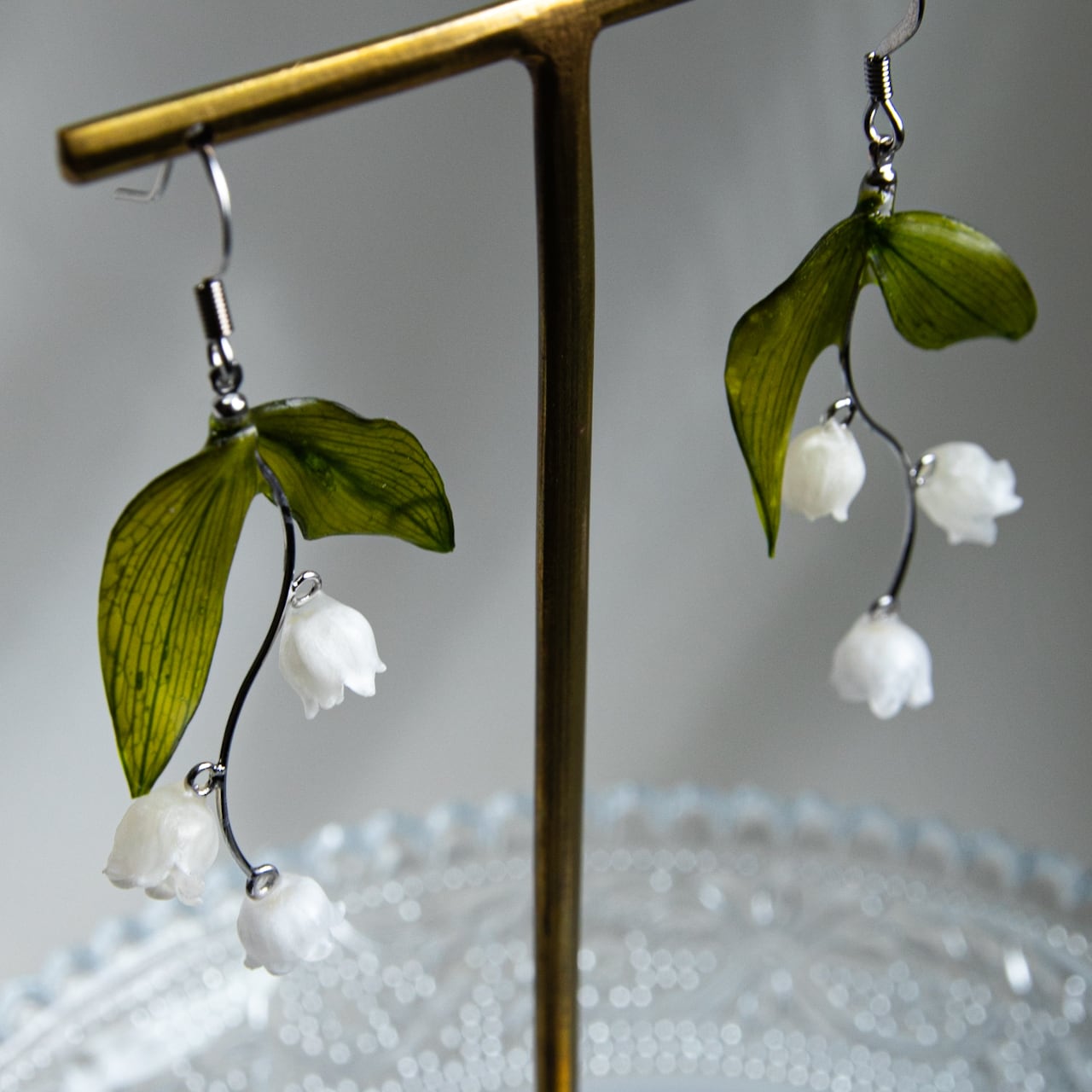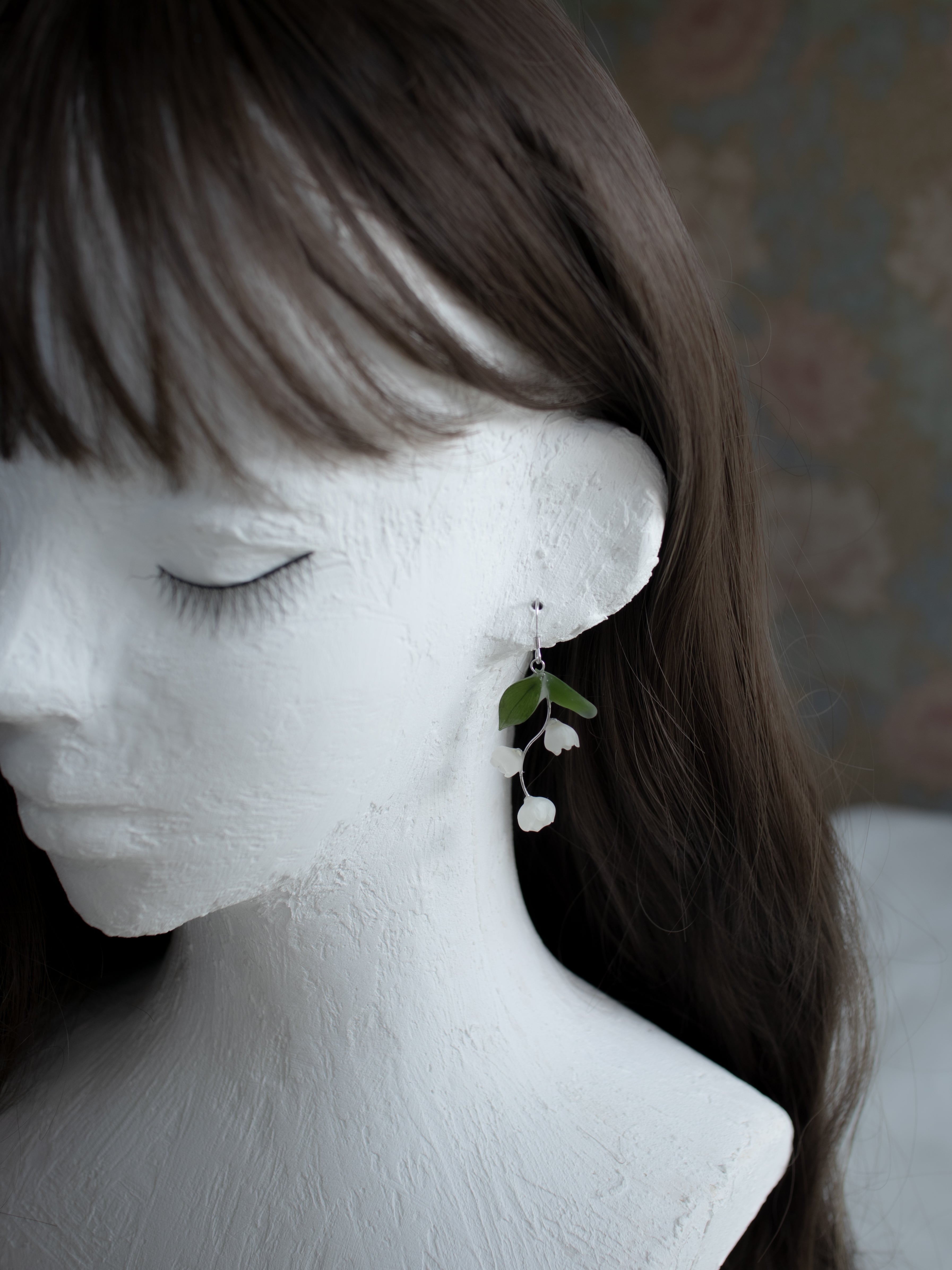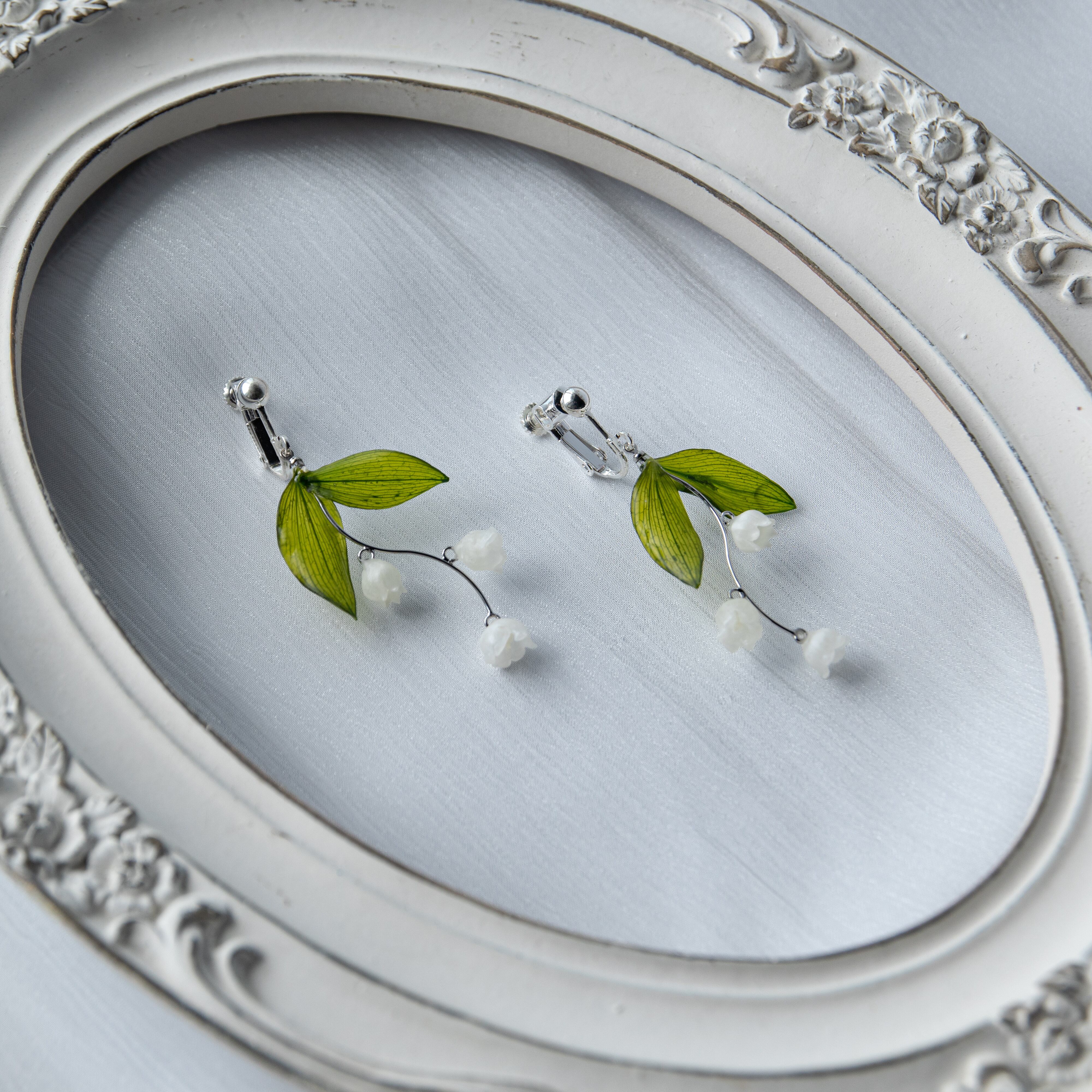 このピアスは、本物のすずらんを丁寧に加工し、優雅なアレンジを施しています。